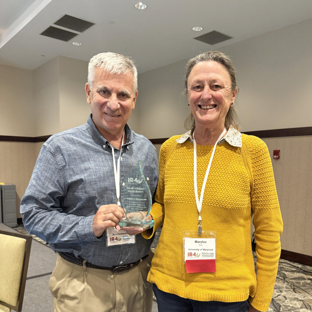 Thierry Besançon’s SOAR Award was presented at the 2025 Food Use Workshop by IR-4 Executive Director Jerry Baron and Northeast Regional Field Coordinator Marylee Ross. Later this fall, Marylee Ross and Megan James Hickman (Assistant Regional Field Coordinator) were able to present Besançon’s plaque to him at the University of Maryland Lower Eastern Shore Research & Extension Center.